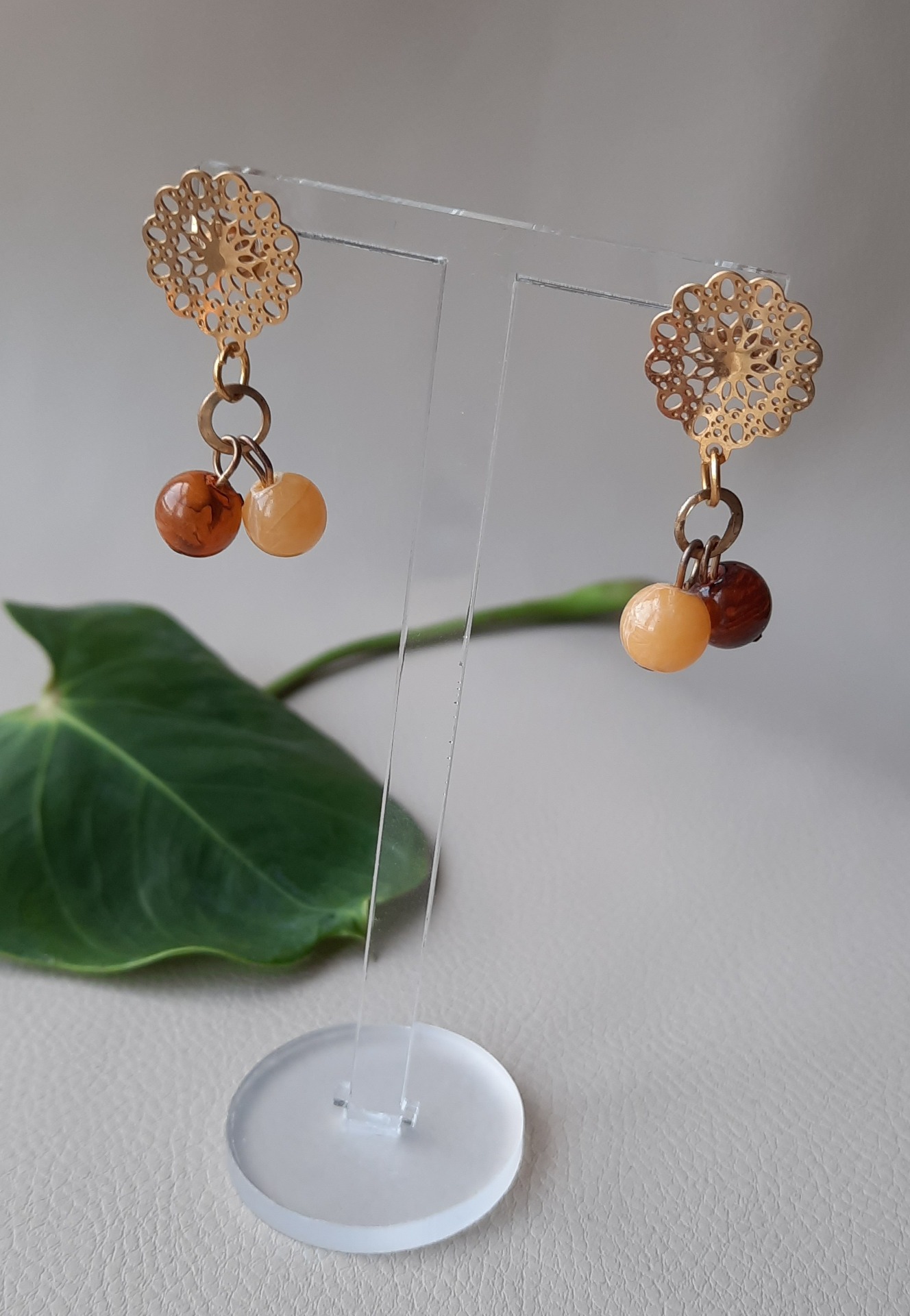 Forgyldt, rustfri stål ørestikker med to glas perler i efterårsfarver. Perlerne har siddet på et armbånd og er ny upcykled til øreringe.