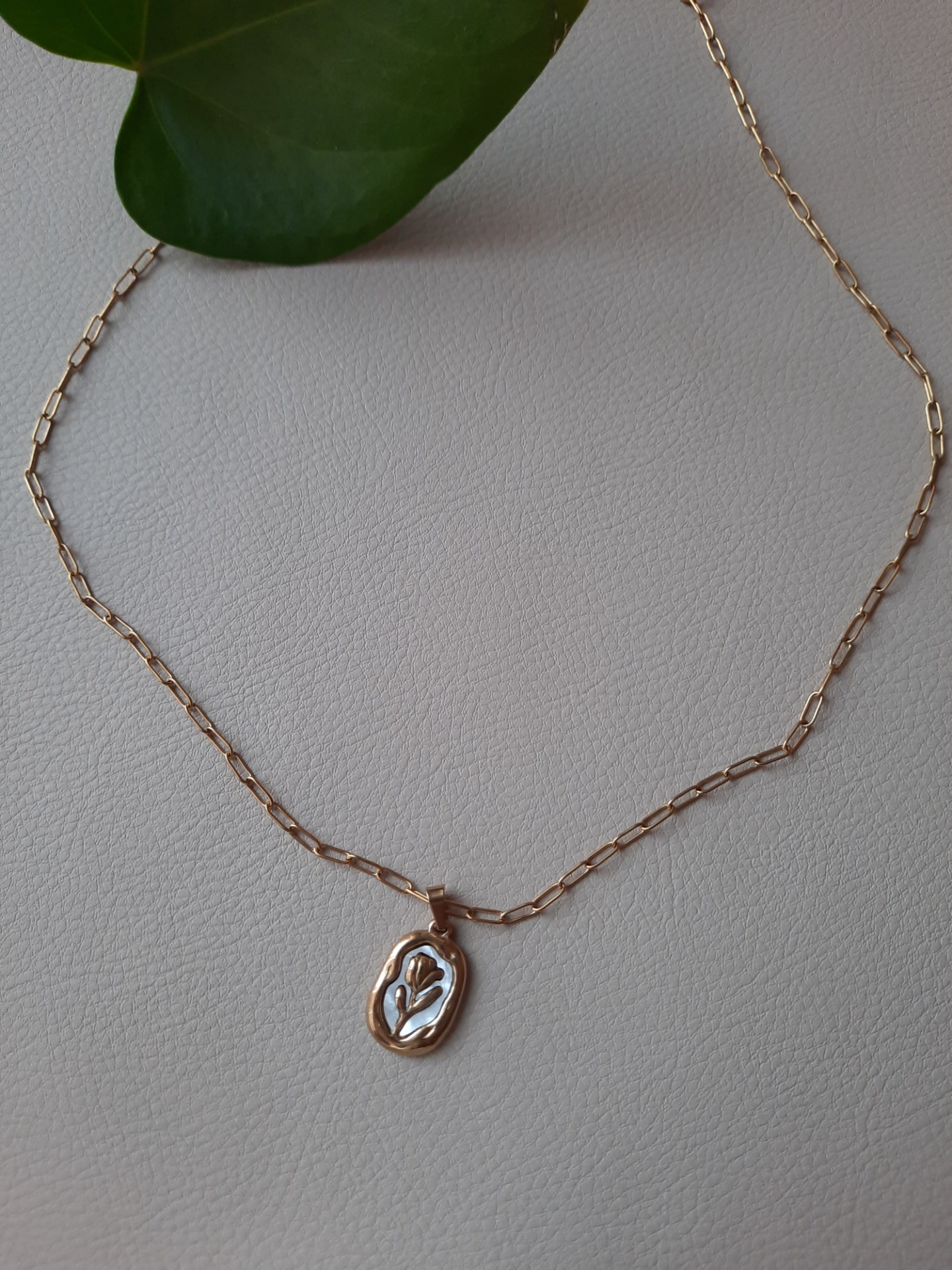 Tulipan Vedhæng i 18k forgyldning med imiteret perlemor som smukt omkranser tulipanen.