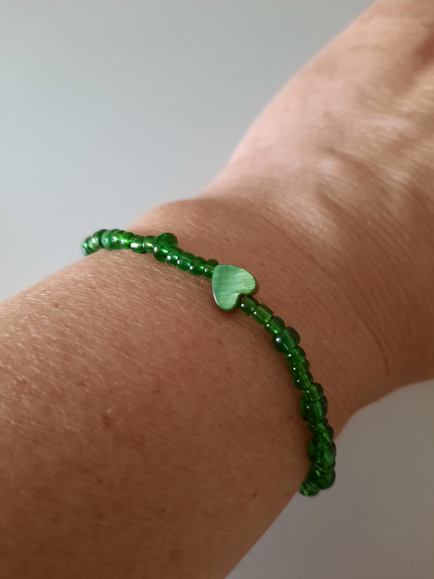 Armbånd i små, mørkegrønne, runde, glasperler og med et grønt perlemors hjerte. Trukket på ekstra stærk elastik.