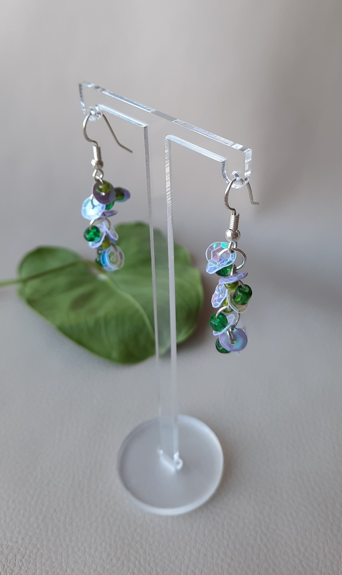 Lys Lilla pailletter med glatte, grønne glas perler. Forgyldte sølv ørekroge.