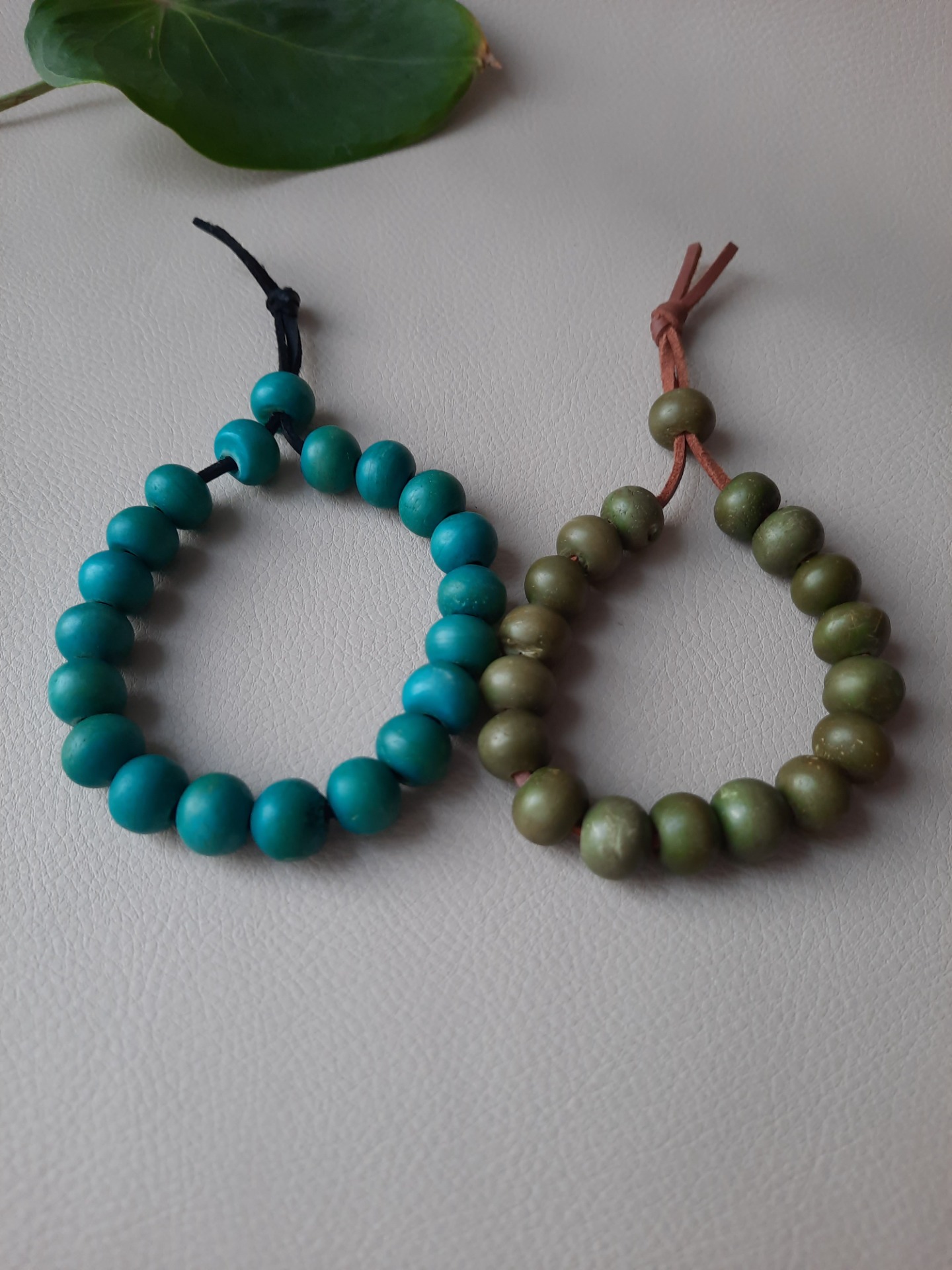 Trukket på sort lædersnor. Er nem at tage på med perle træk lukning.