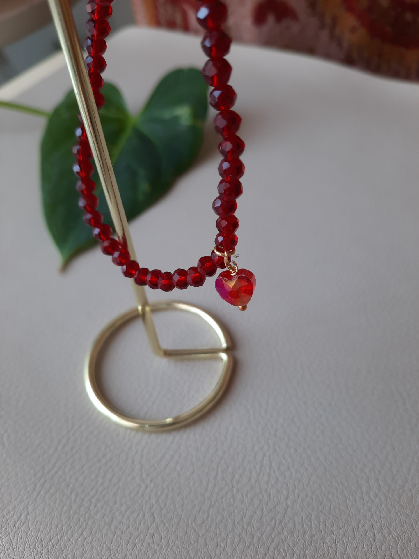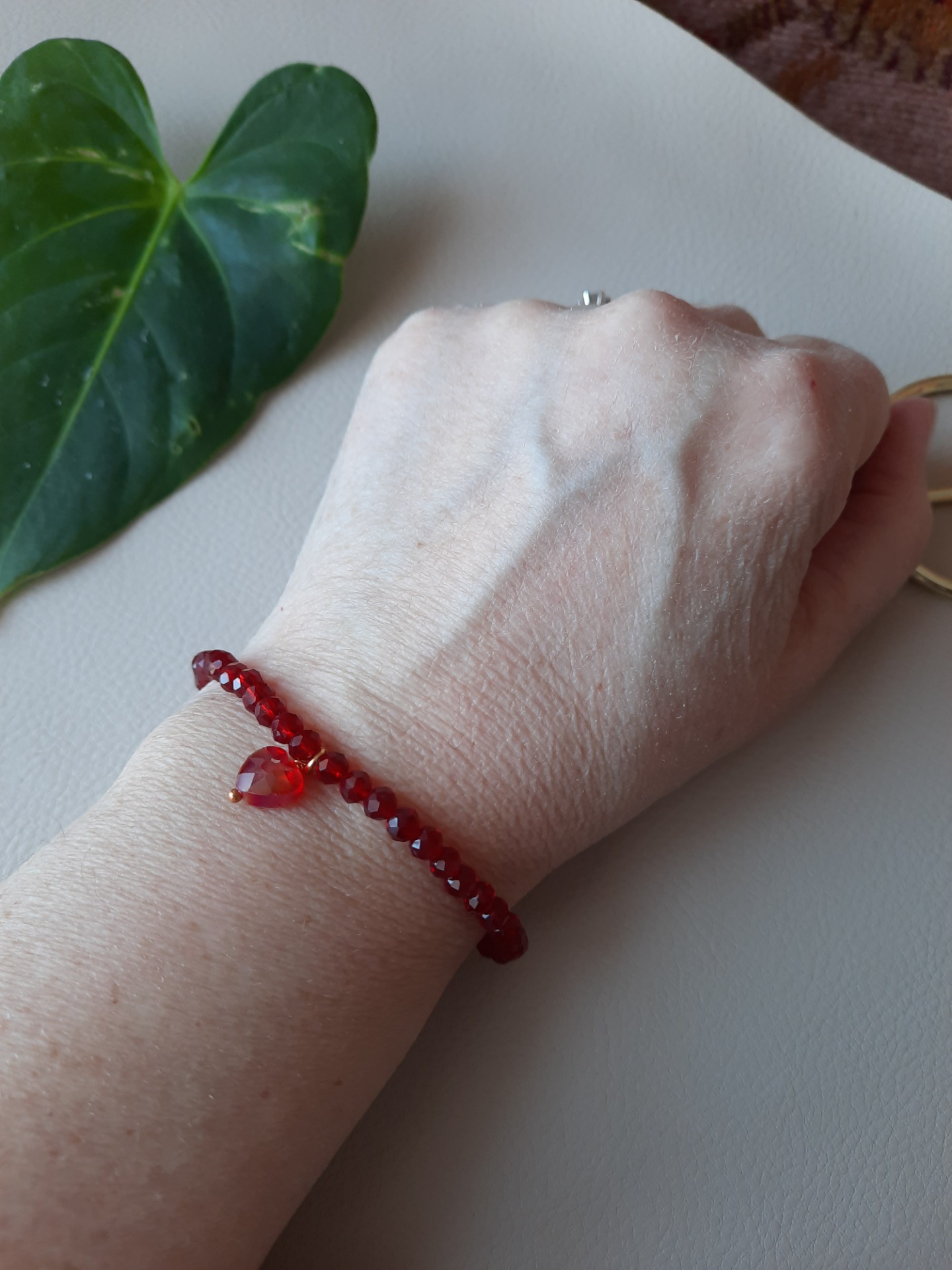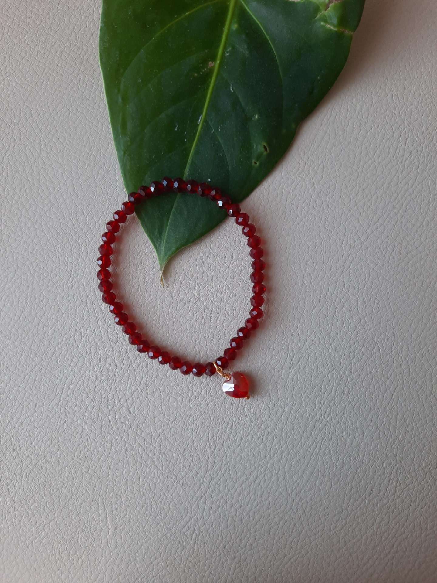 Lavet med røde, facetterede glaskrystaller og med et hjerte i Rhin-glaskrystal.