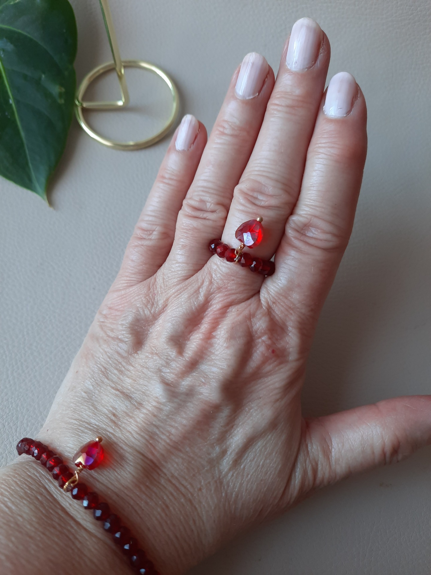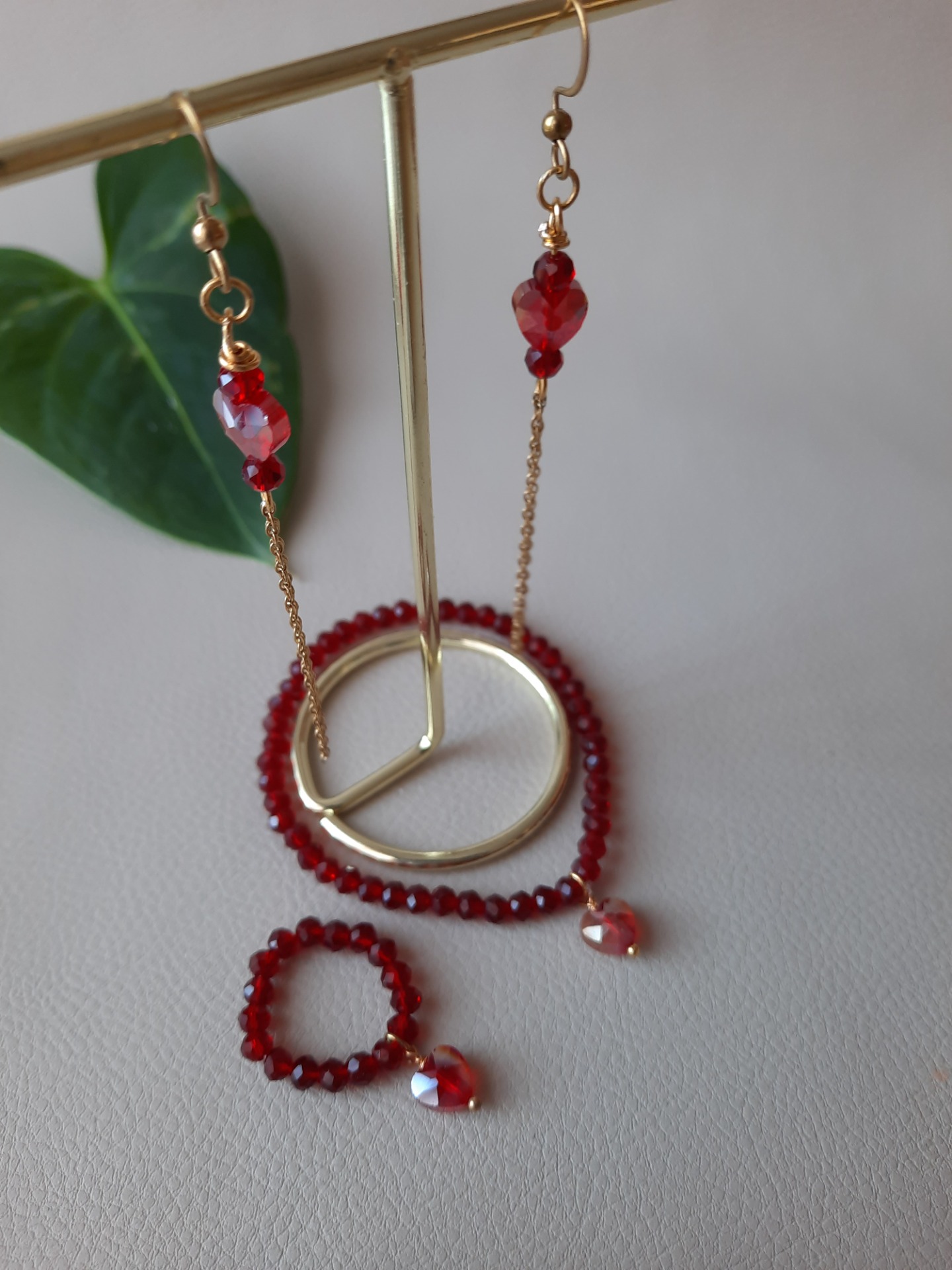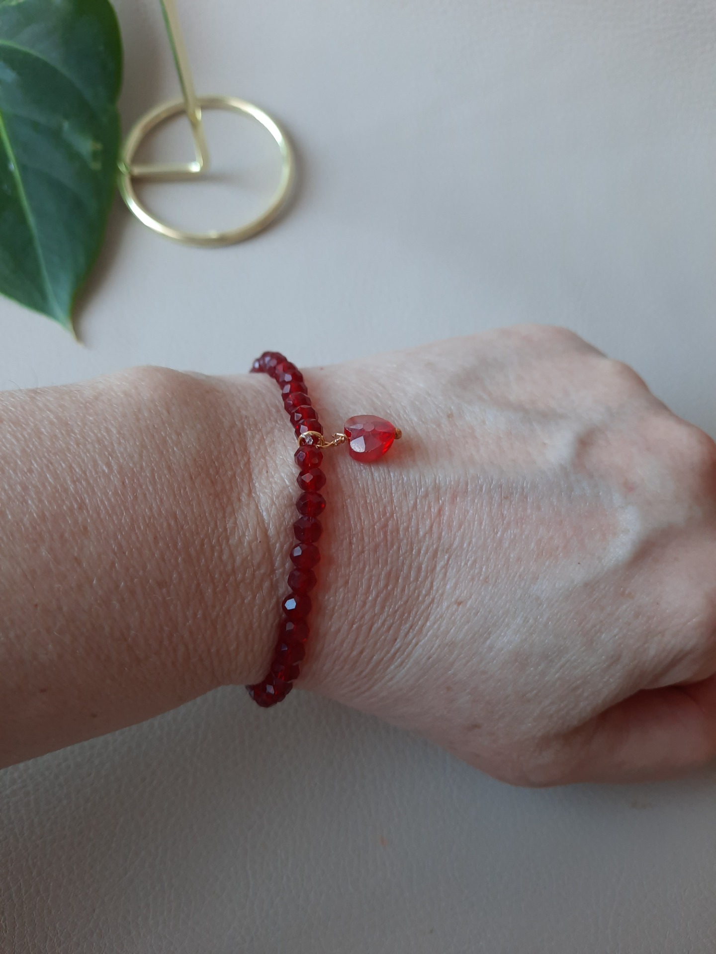 Lavet med røde, facetterede glaskrystaller og med et hjerte i Rhin-glaskrystal.
