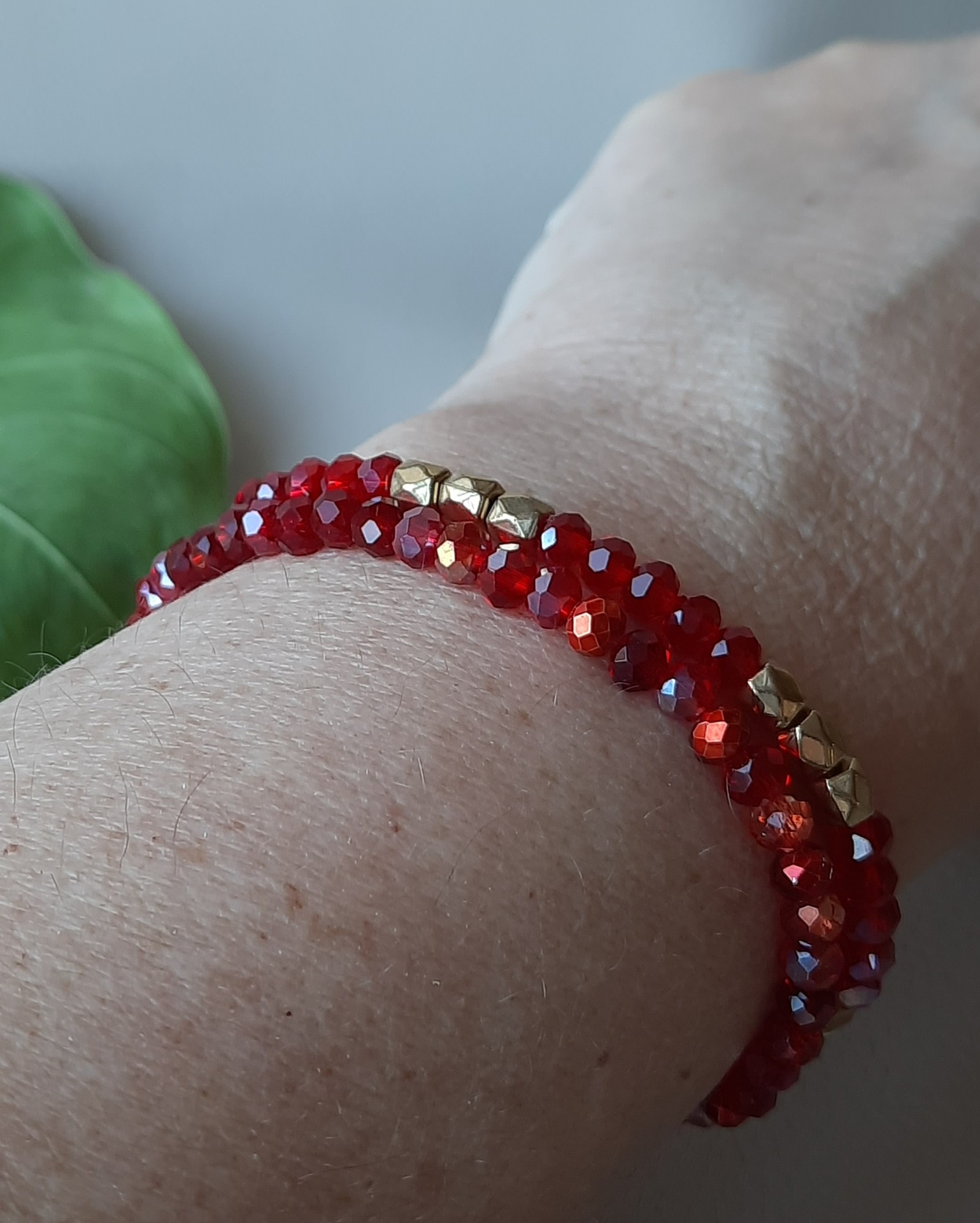 Lidt sparkle til den lille sorte kjole. Røde runde facetterede, glas krystal perler, på stærk elastik snor.