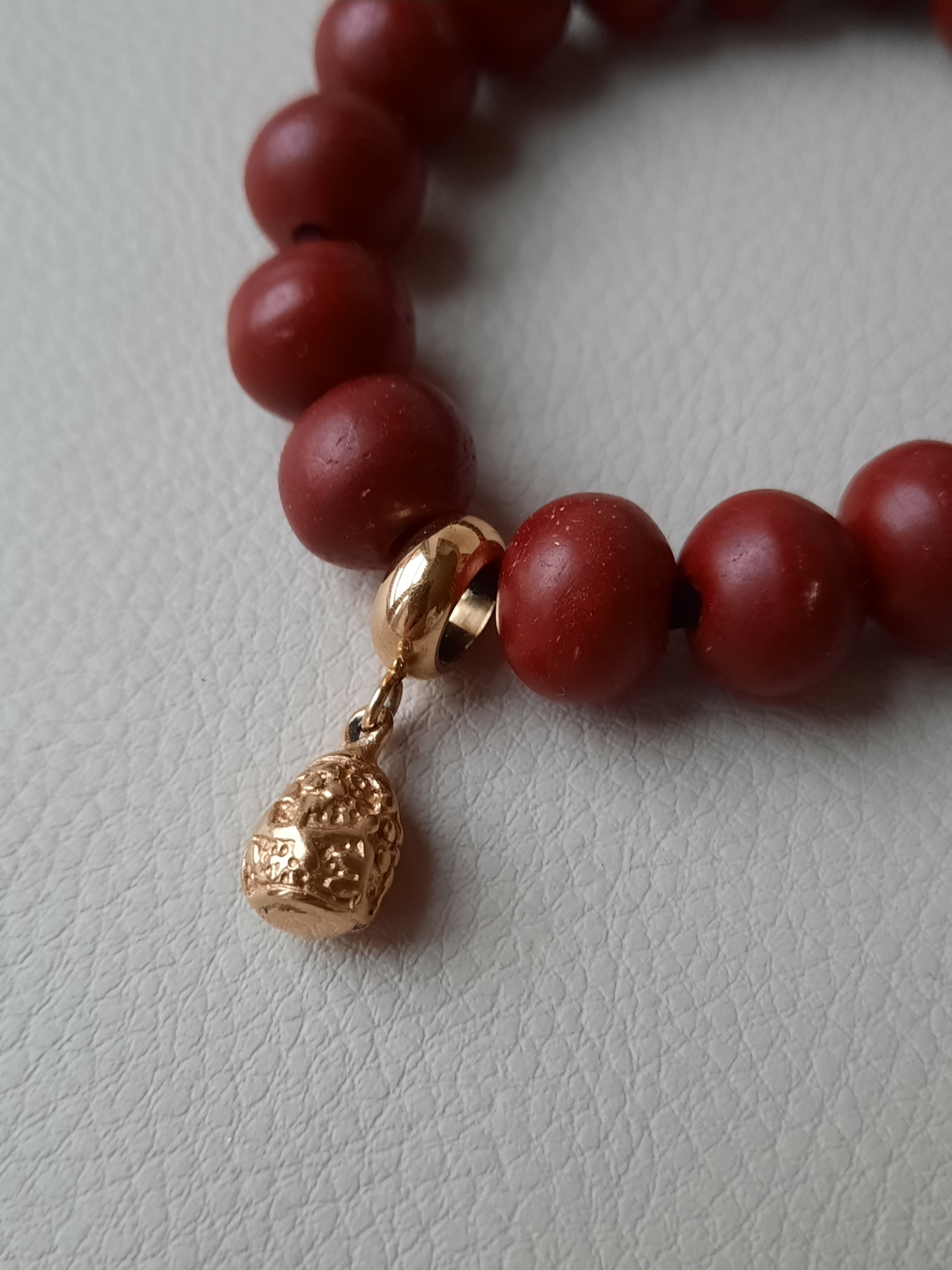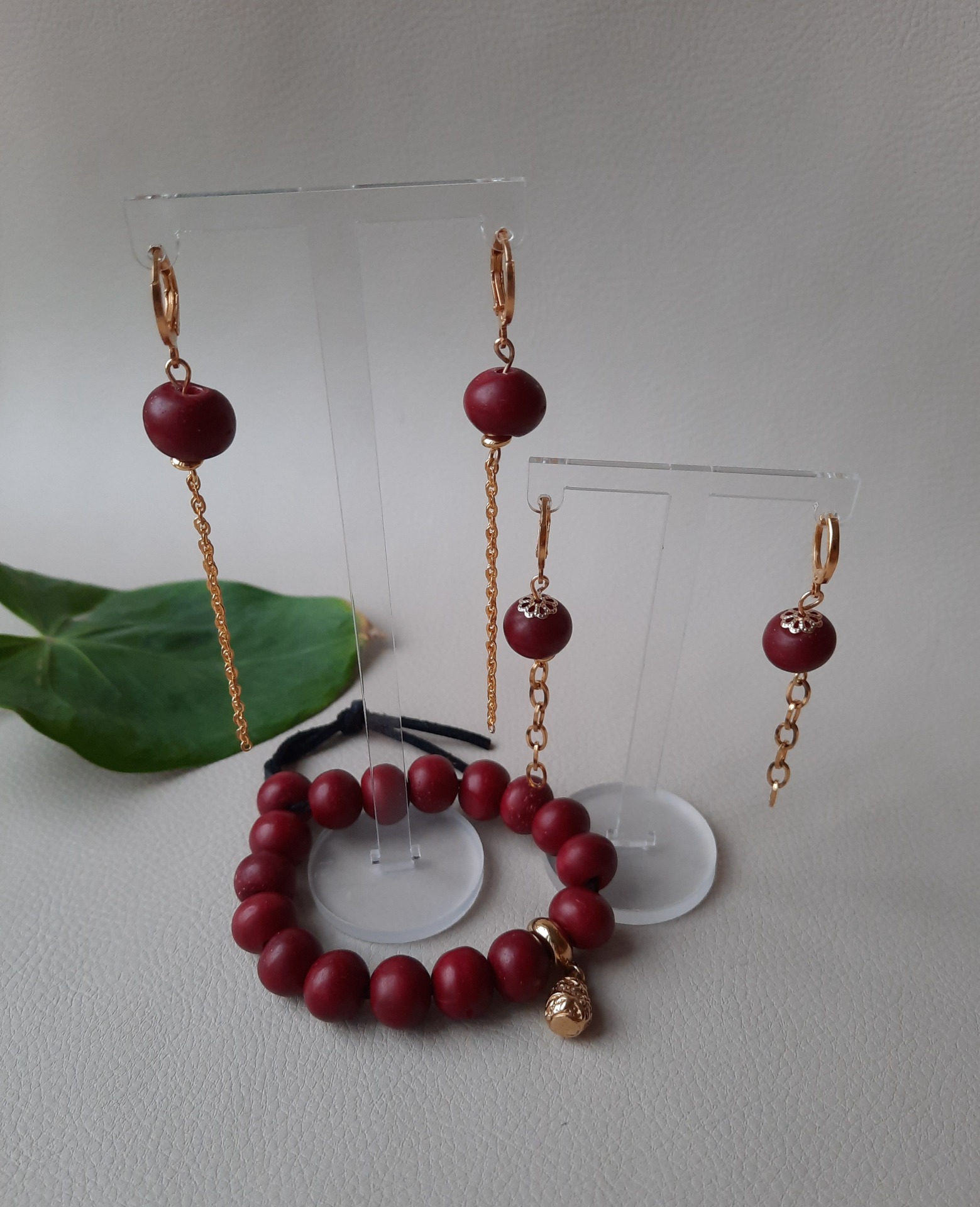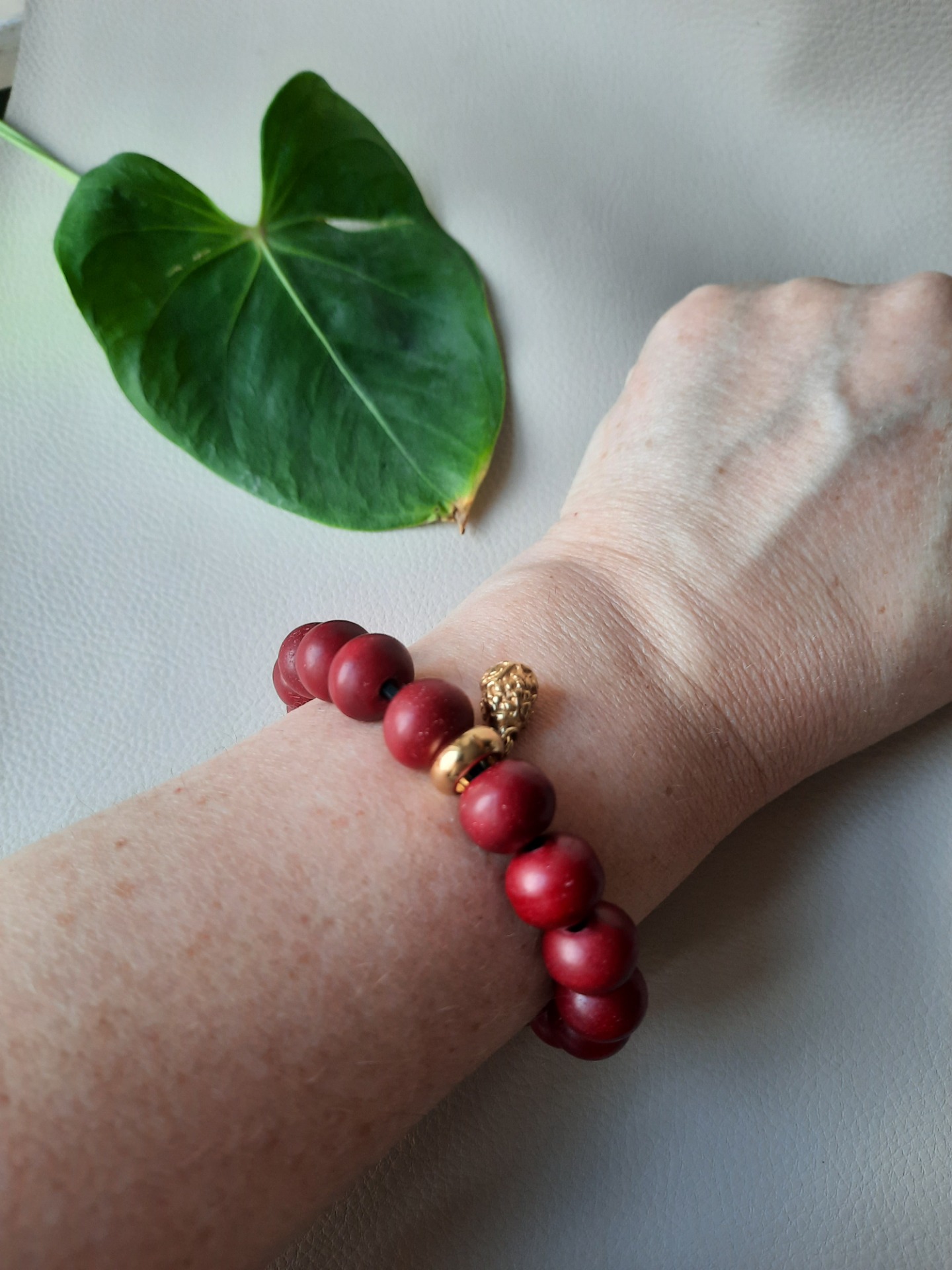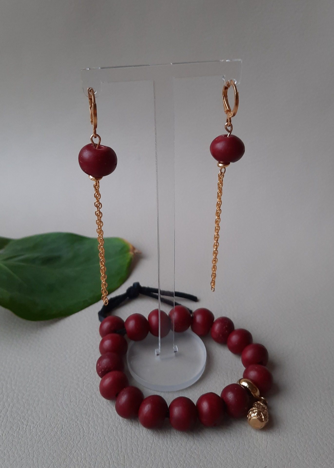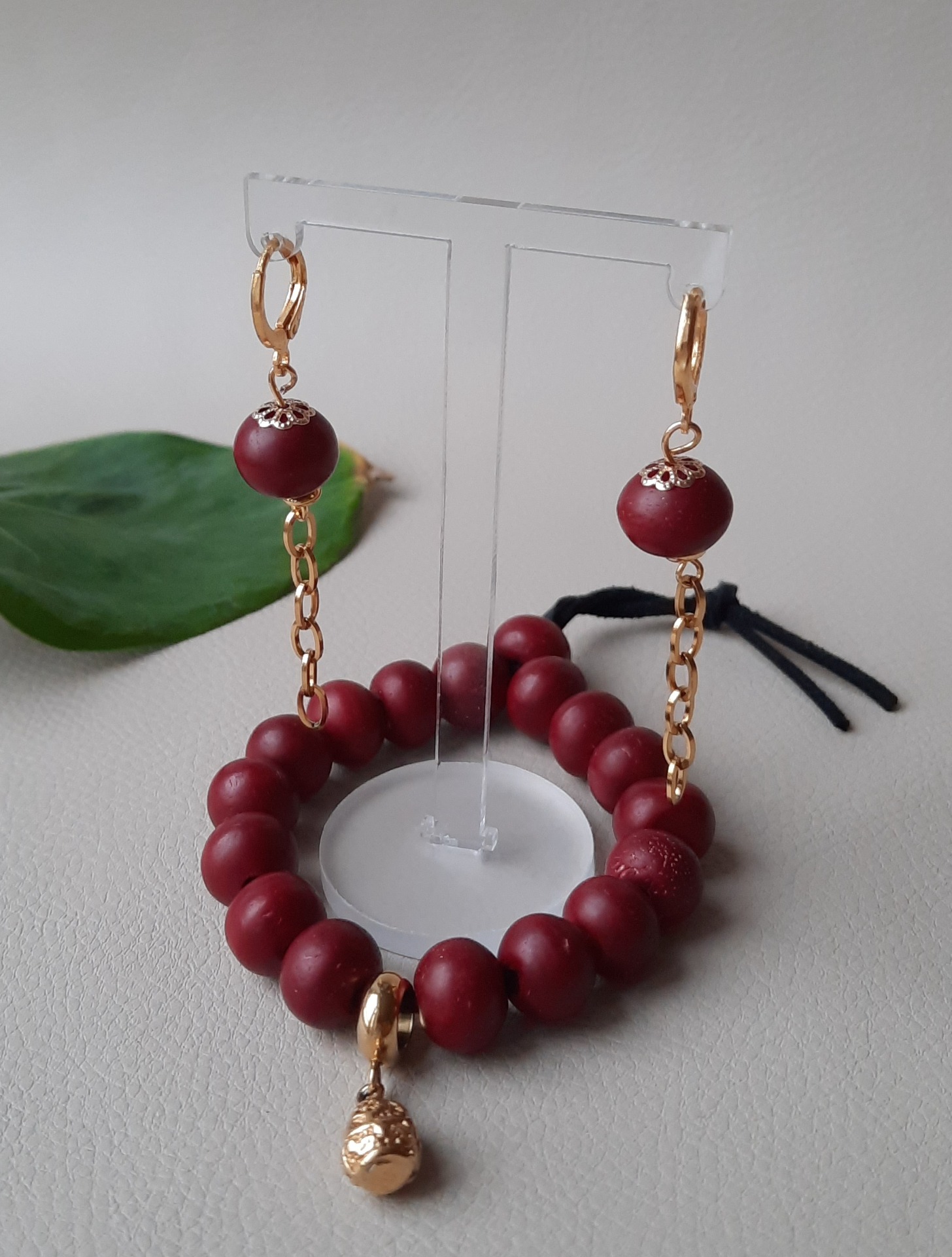 Smukke bordeaux røde, porcelæns agtige perler, trukket på sort lædersnor.
