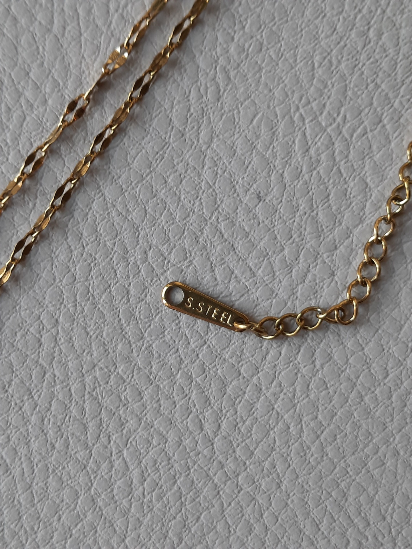 Superfin og tynd kæde. Meget smuk som base for stak. Den er 40cm+5cm. Her ses den med bogstavvedhæng.